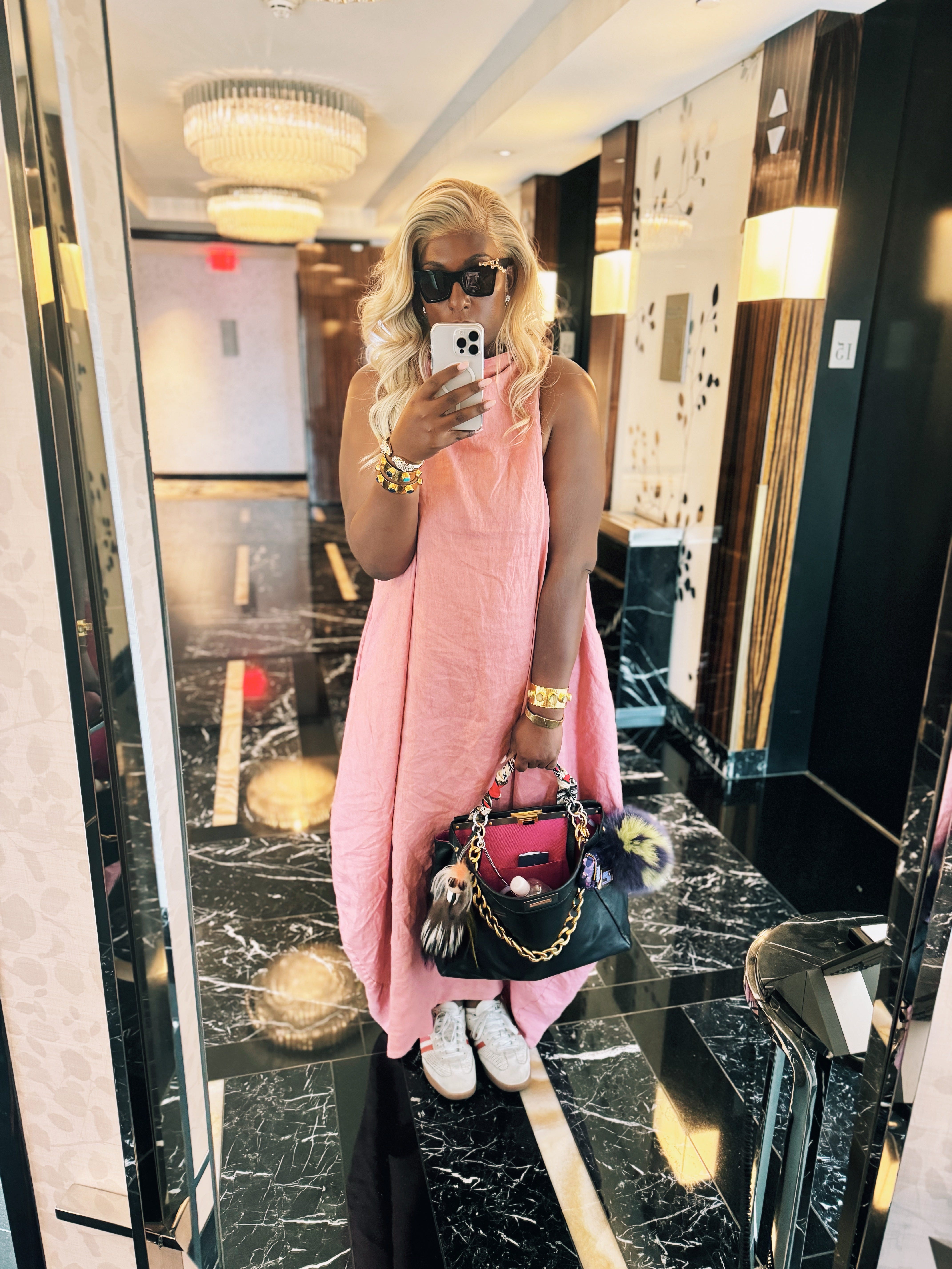 More versatility: I travelled to visit my clients for my consulting firm, and visited San Francisco, Seattle, Los Angeles, Boston and Newport, Rhode Island and back to Houston with my dress in tow. Adding a glam belt and accessories, and a minimalist statement mule heel- I was able to wear the dress to a garden party and be a belle of the ball. And again, my favourite combo- adidas sambas and sunnies- with a cashmere sweater tied around the shoulders for old money opulence- and I was off to the airport in style.