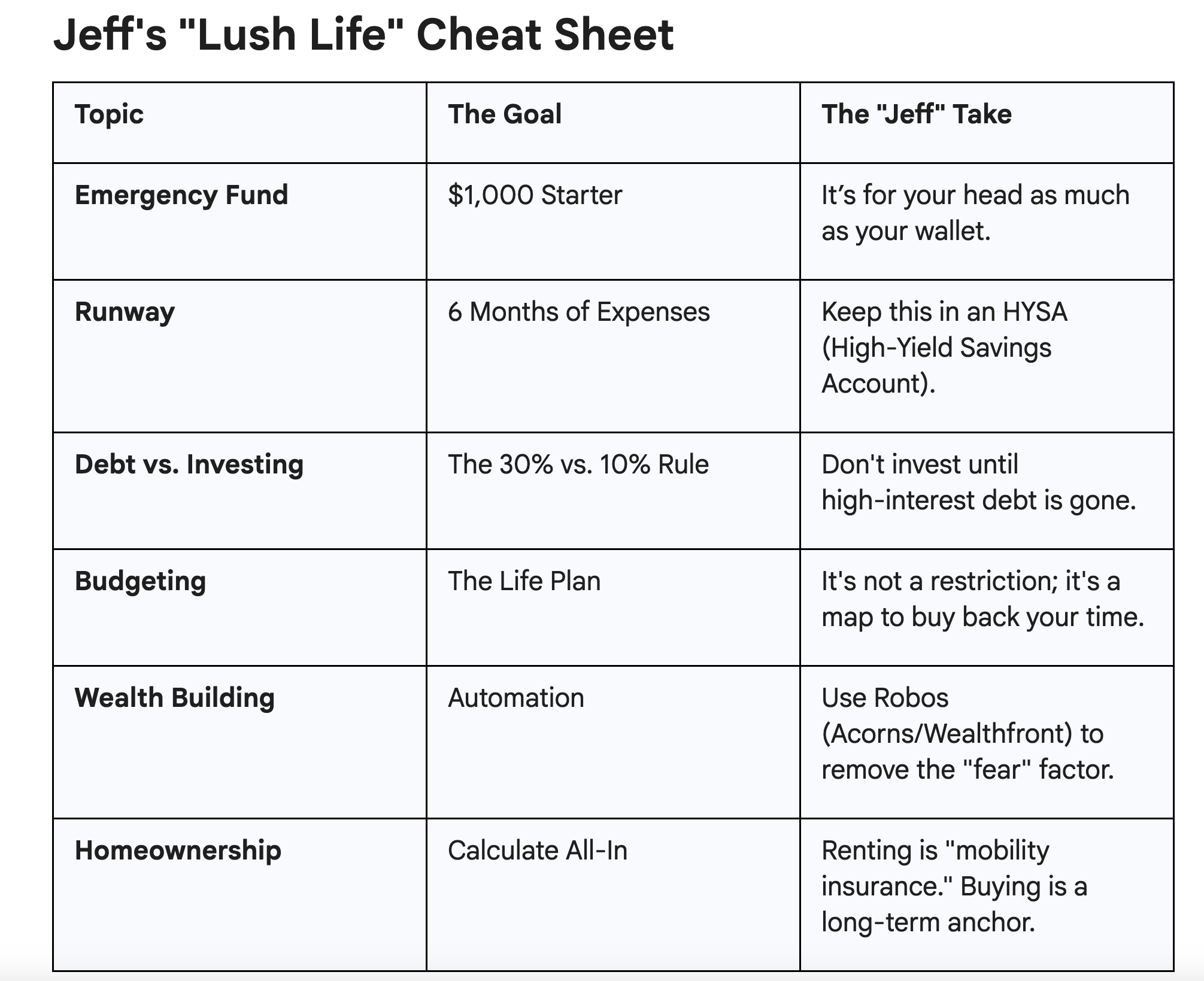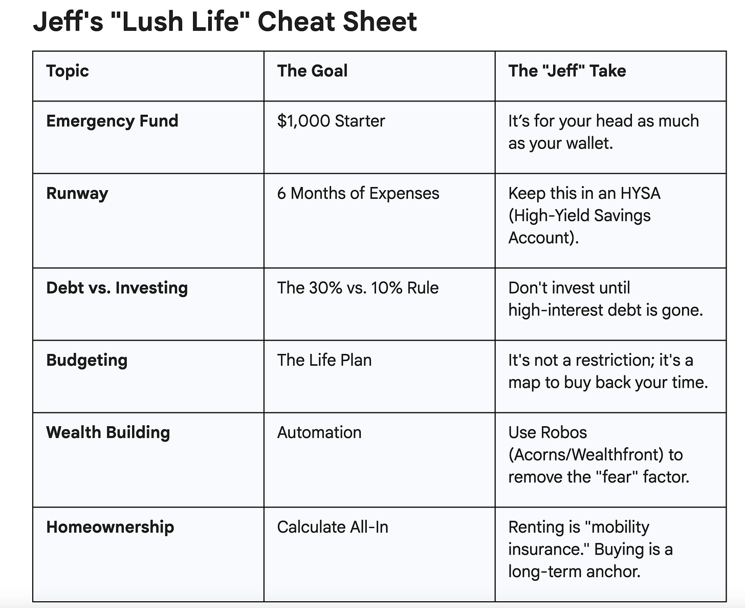 Getting his start in the tech c-suite, Jeff began working with tech founders and start-ups as an Angel Investor, and has been working to make personal finance information more widely available. He’s a dear friend of mine of course, and I bug him regularly on questions I have on finance, budgeting and investing- and he thankfully never hides the plug- and I’ve learn so much from him I thought I’d share with ya’ll.